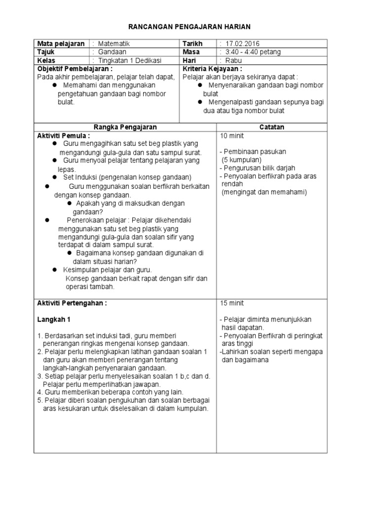 Coontoh Rancangan Pengajaran Harian Matematik Tingkatan 4 Pdf